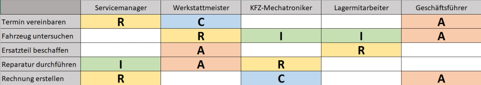 Sehen wir uns das ganze mal am obigen Beispiel an: Beschrieben wird der allgemeine Ablauf bei Eingang einer Reparaturanfrage in einer Kfz-Werkstatt. Der Servicemanager ist hierbei derjenige, der beim Erstkontakt den Termin mit dem Kunden ausmacht und deshalb die Durchführungsverantwortung für den Teilschritt „Termin vereinbaren“ erhält. Da er den Termin mit dem Werkstattmeister abklären muss, um sicherzustellen, wann genau Kapazitäten für die Reparatur vorhanden sind, wird dieser als zu konsultierend festgehalten. Als Leiter des Betriebs ist der Geschäftsführer bei Komplikationen oder ähnlichem allgemein der rechtlich Verantwortliche, so auch in diesem Fall.