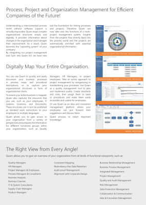 Understanding an interconnected processworld without software support is virtually impossible. Quam maps complex organizational structures simply and digitally. It provides information about changes in the organization and manages their improvement. As a result, Quam becomes the "operating system" of your company.