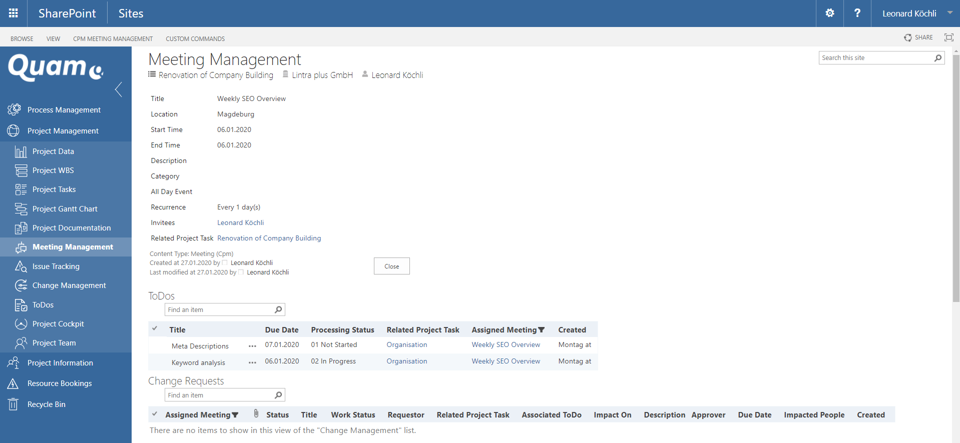 Meeting management allows you to organize your project meetings and manage records of project meetings. For each meeting, an appointment can be created in a calendar overview and sent as an invitation to the participants. A meeting can already be organized with reference to a specific work package. Recurring meetings can be created as a series of appointments.