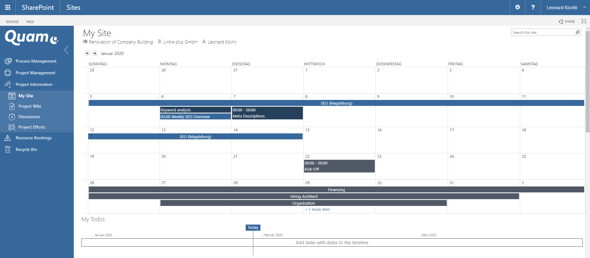 The project participants receive a consolidated overview of all their own responsibilities on their personal page. The work packages, milestones and sub-projects which have not been completed and for which you are responsible or to which you are assigned, to-dos, problems, change requests and risks for which you are responsible as well as the calendar dates are displayed there and can be edited directly.