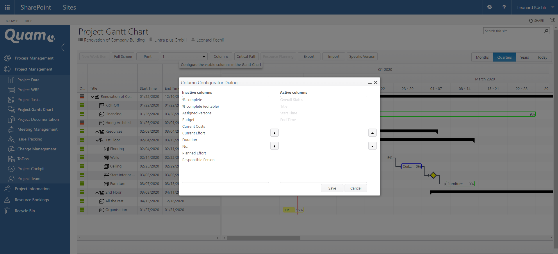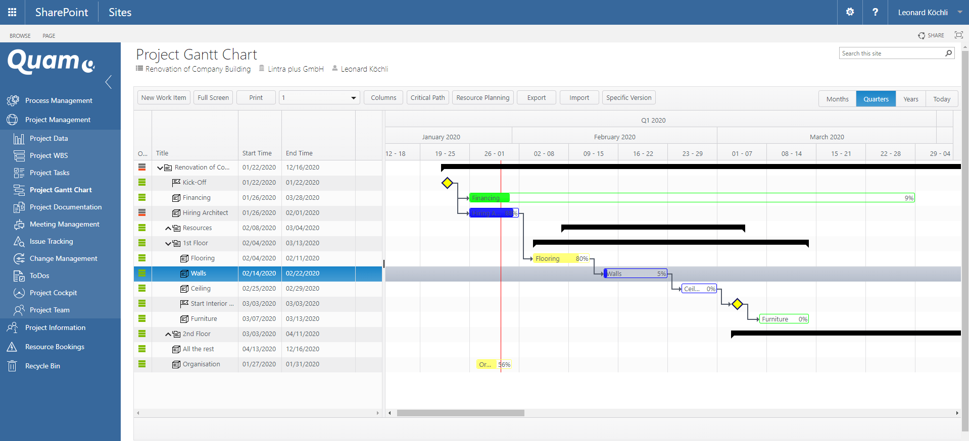 The approved project plan is the project plan that is visible to all team members. In this plan, the project team can edit existing project tasks, but cannot delete existing ones or create new tasks. Graphical indicators provide visual information about the status of the work packages with regard to different dimensions.