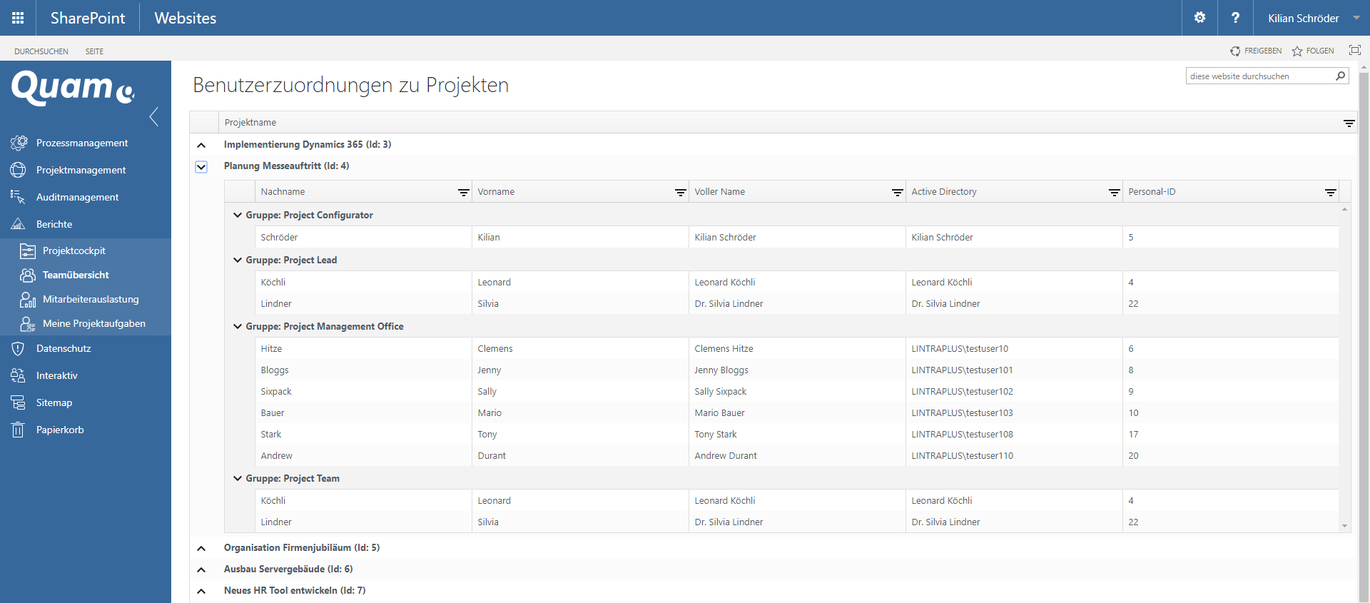 Die Projektteilnehmer aller Projekte werden in der Projektmitarbeiterliste des Projektportfolios zentral verwaltet. Neben Mitarbeitern der eigenen Organisation können auch externe Projektteam-Mitglieder verwaltet werden, die über kein Benutzerkonto auf dem SharePoint verfügen, aber dennoch als Ressourcen in der Projektplanung berücksichtigt werden sollen.