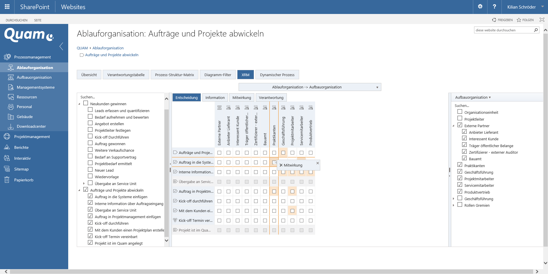 Mit Quam betreiben Sie aktives Prozessmanagement, indem Sie Ihre Prozesse aufnehmen und auf Sinnhaftigkeit sowie Redundanz überprüfen und neu organisieren. Ob Prozesslandkarte, Verfahrensbeschreibung oder Prozess-Steckbrief – Sie stellen sich Ihre Prozessbeschreibungen und prozessbezogenen Auswertungen (Kennzahlen und Matrizen) individuell zusammen.